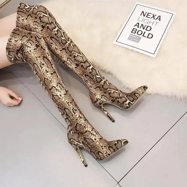 Botas de cano alto com salto de estilete estampado e pontiagudo sobre o joelho