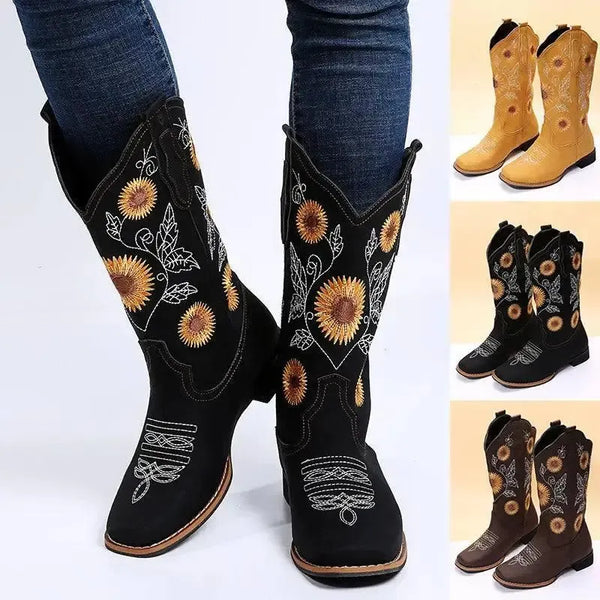 Botas de cowboy Mulheres Girassol Bordado Sapatos Baixo Calcanhar