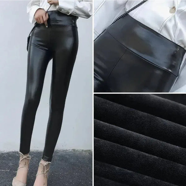 Calças de couro Calças grossas de cintura alta para mulher em couro PU