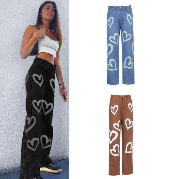 Calças de ganga de pernas largas com estampado "Love Print", justas, largas, azul claro / 2XL