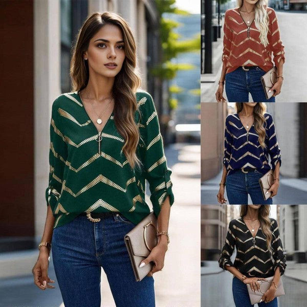 Camisa casual de manga comprida com decote em V e riscas para mulher