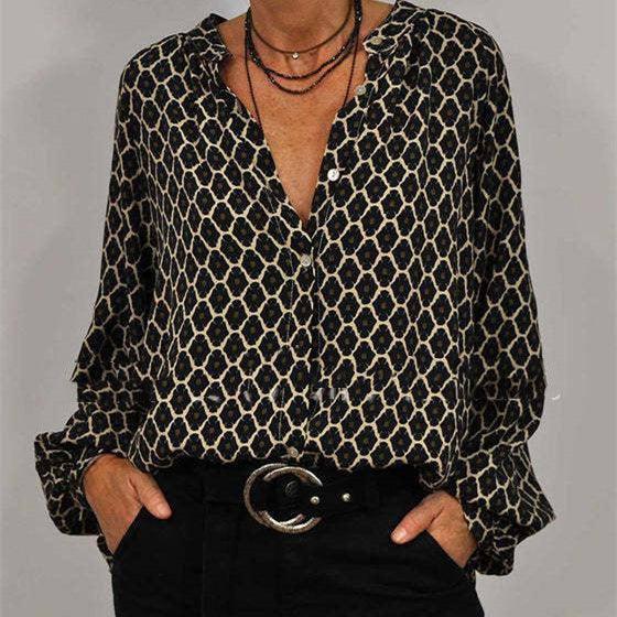 Camisola feminina com decote em V e manga comprida com estampado da moda