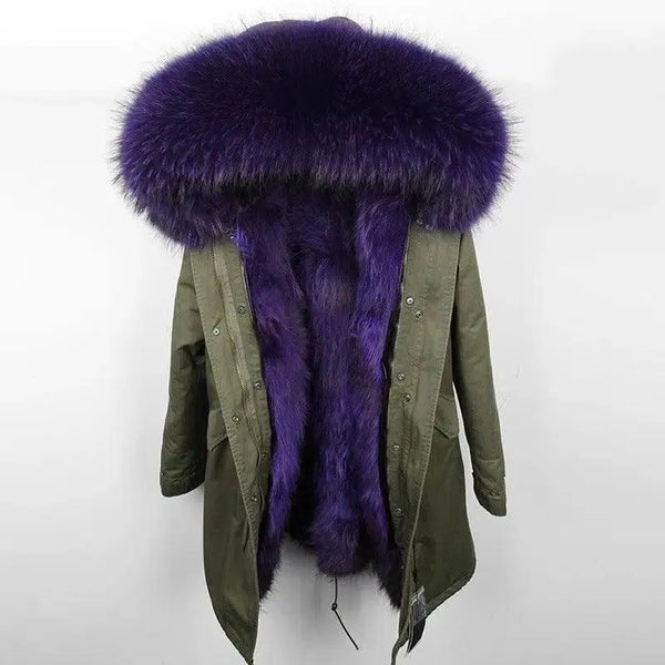 Casaco parka com gola de pele de guaxinim de grandes dimensões