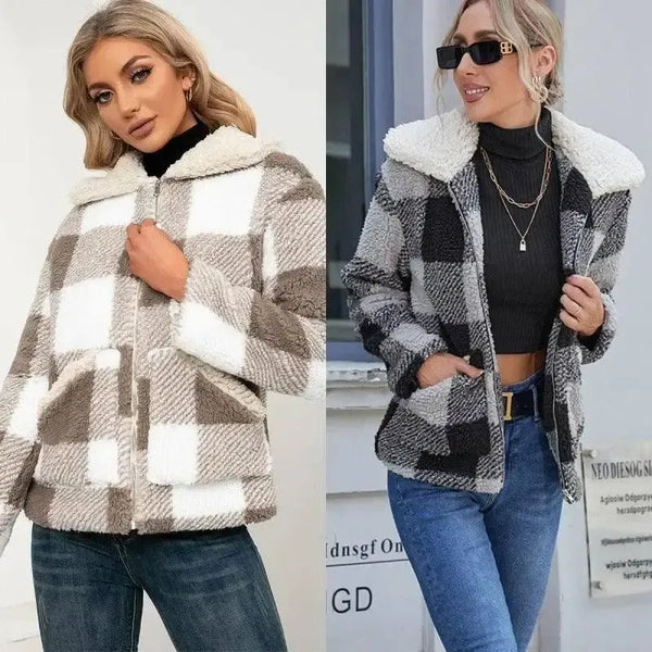 Casaco Casual Check Plush Lapel Jacket Lamb Fleece Check Pocket Top