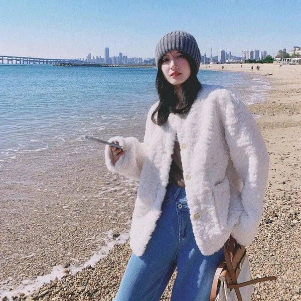 Casaco de pele de coelho com fivela metálica e pescoço redondo para mulher
