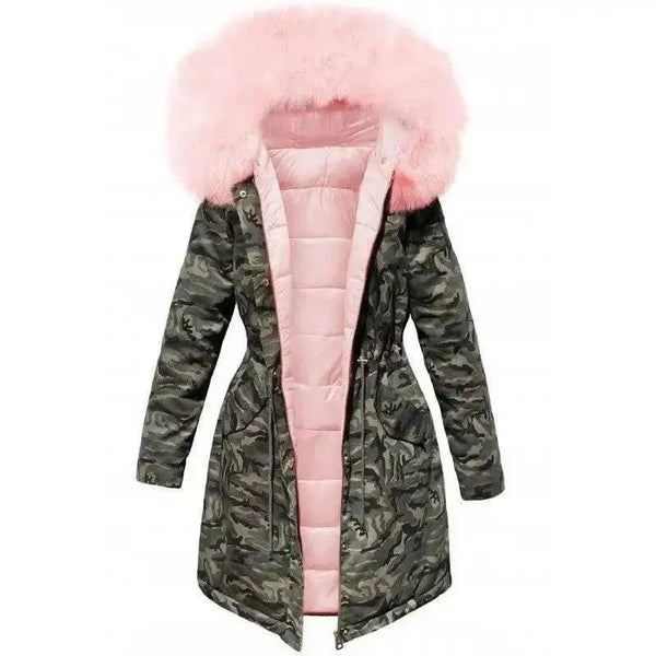 Casaco de pelúcia espesso, solto, com gola de pelo grande, comprimento médio, camuflado