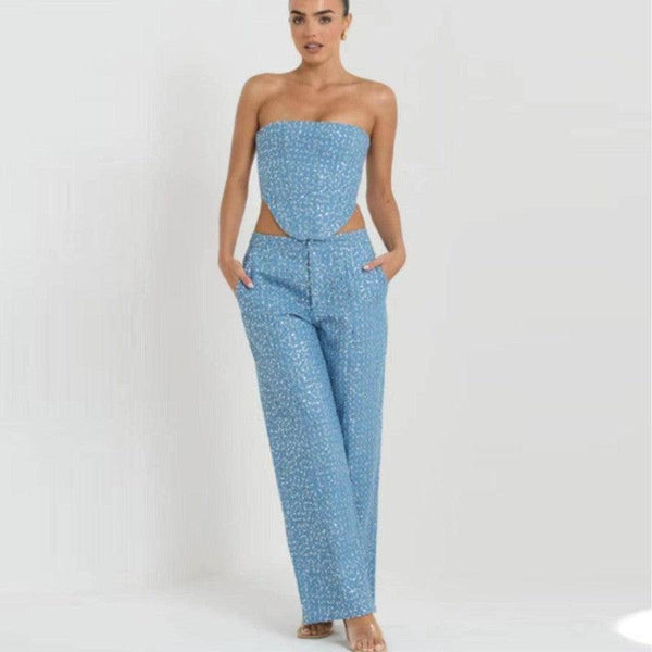- Tipo de Produto: Top de tubo com lantejoulas de ganga e fato de calças de pernas largas