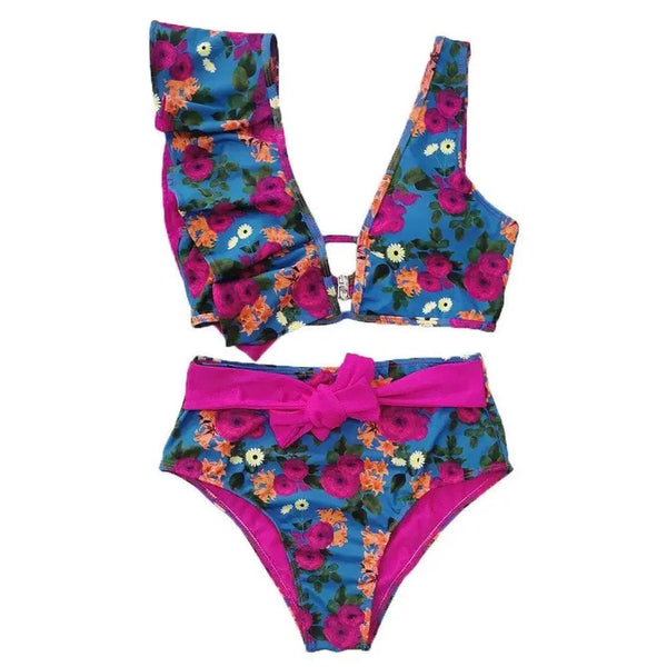 Fato de banho de biquíni de cintura alta com folhos assimétricos