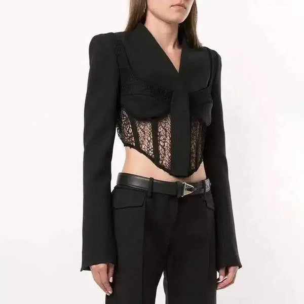 Elegante detalhe de renda: O blazer apresenta rendas intrincadas que adicionam um toque de fascínio feminino ao design geral, perfeito para quem aprecia artesanato fino.