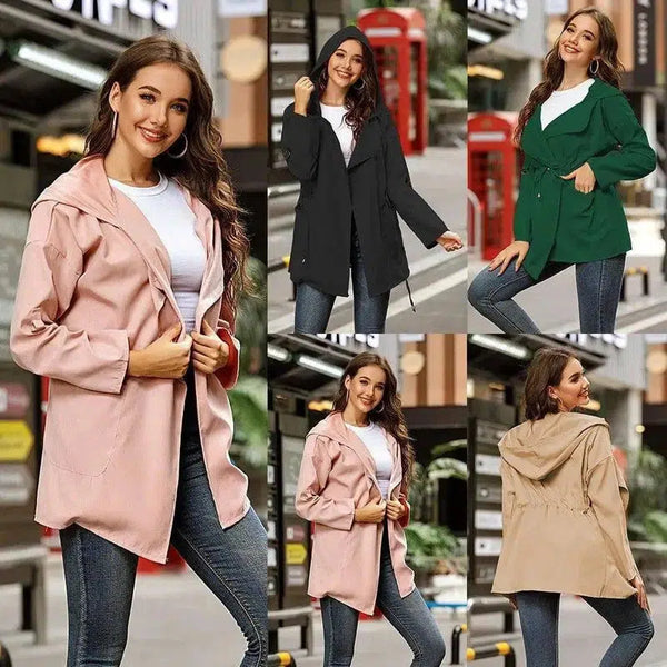 Gabardine de comprimento médio com capuz de cor sólida