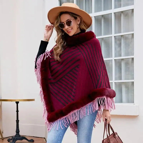 Drizzling Fur Collar Pullover Tassel Knitted Cape For Women (Capa de malha com borla para mulher)