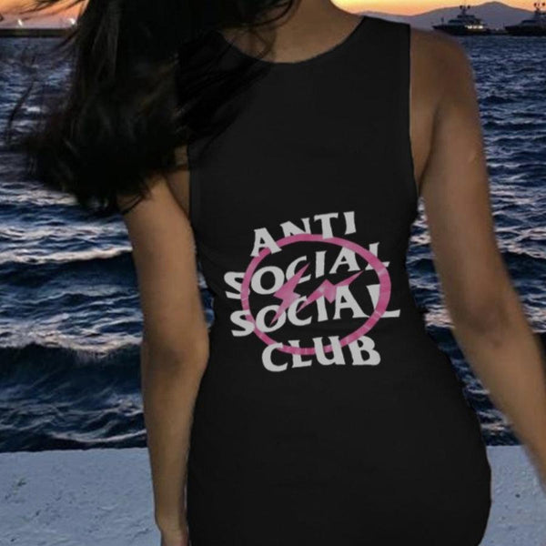 Embrace bold streetwear vibes with the Anti Social Graphic Bodycon Dress. Designed with a sleek, fitted silhouette and eye-catching typography print, this dress is perfect for those who walk their own path. The soft stretch fabric hugs your curves comfortably while the bold “Anti Social Social Club” graphic adds attitude to your look.
