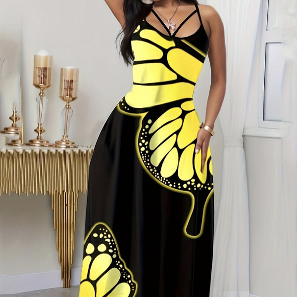 Ladies' V-Neck Elegant Butterfly Print Maxi Dress – Stylish and Comfortable Black Long Skirt Dress