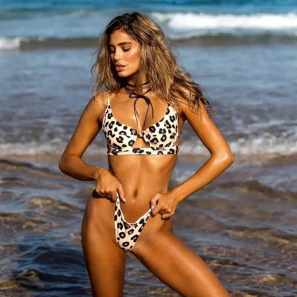 - Corte: Biquíni de duas peças, com uma parte superior e inferior triangulares clássicas