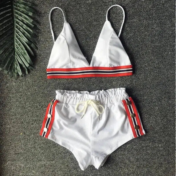 - Design: Conjunto de biquíni de três peças com um estilo de maiô dividido