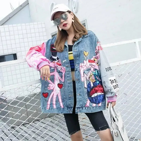 Ganga de comprimento médio com costuras estampadas com lantejoulas de leopardo dos desenhos animados