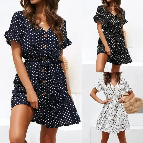 Vestido casual de senhora em chiffon com decote em V e alças de bolinhas