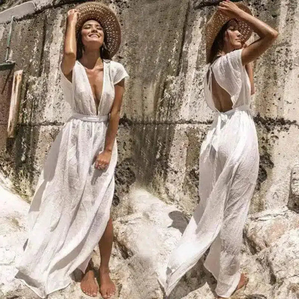 Vestido maxi de verão com decote em V e cintura atada