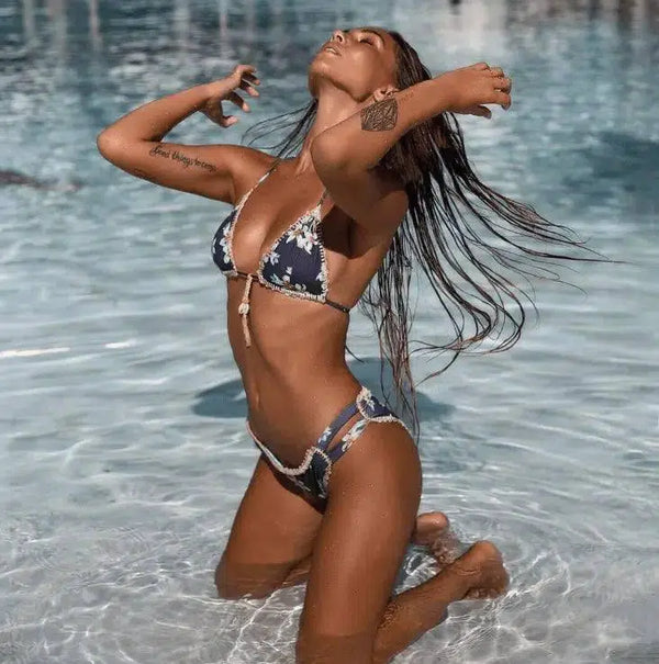 Fato de banho azul escuro tricotado à mão com estampado de corpo dividido