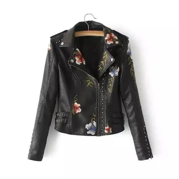 - Tipo de Peça: Jaqueta de couro sintético bordada