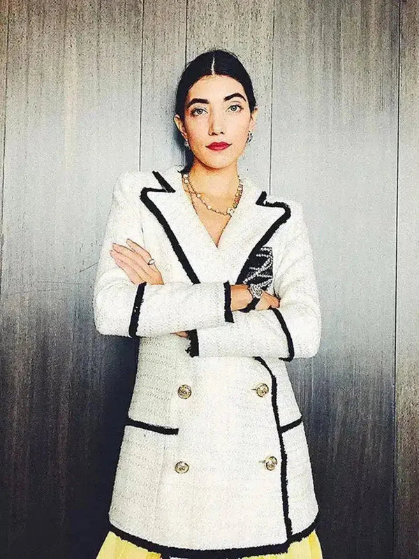 - Cor: Principalmente off-white com guarnição preta contrastante