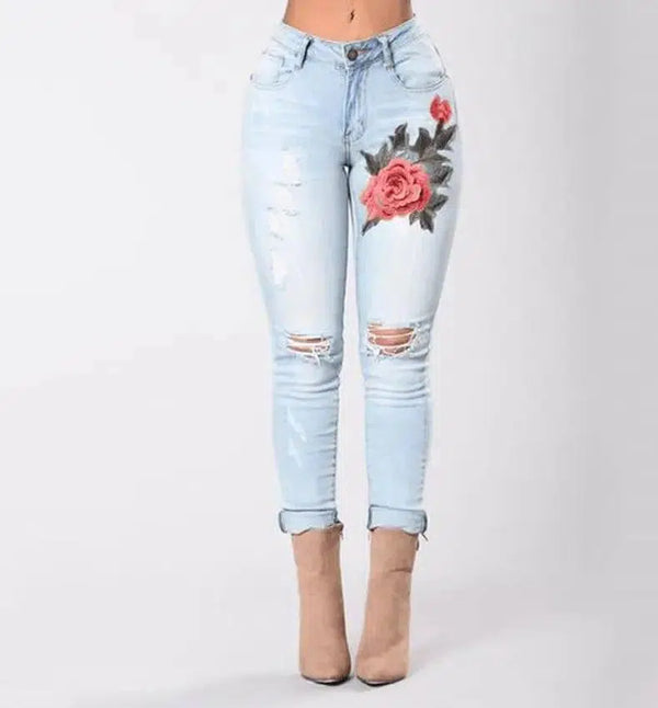 Calças de ganga de alta elasticidade bordadas Fashion Hole Calças de mulher