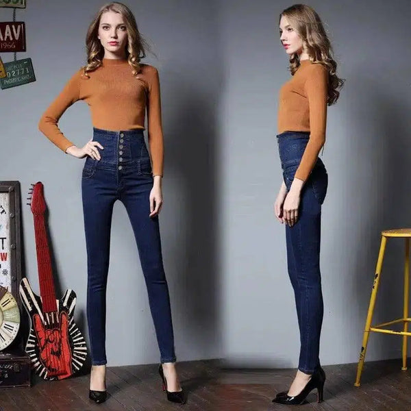 calças de ganga de cintura subida para mulher com pés elásticos finos calças a lápis