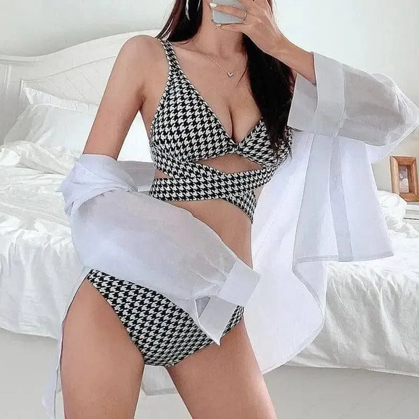 Descrição do Produto: Biquíni de Fato de Banho Houndstooth Cross-Tie