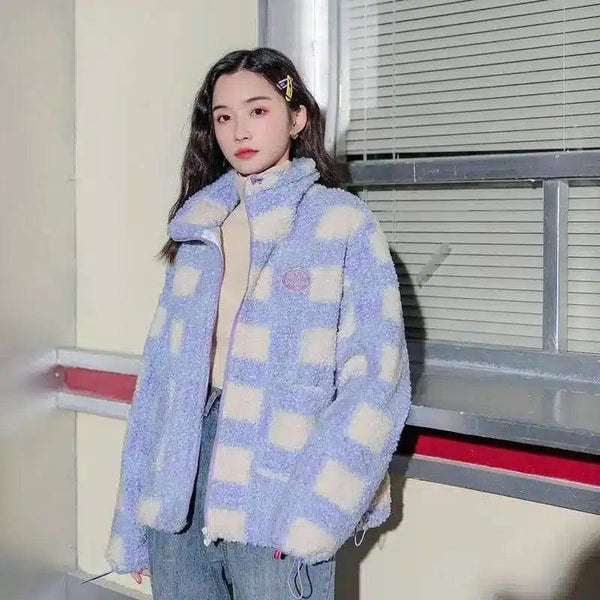 Casaco xadrez de lã quente de veludo falso de borrego para senhora