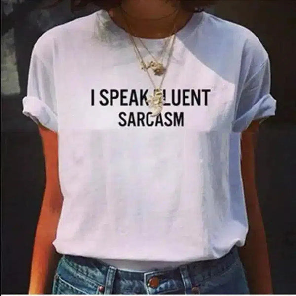 Estampa de declaração em negrito: Faça uma declaração com a divertida impressão "I SPEAK FLUENT SARCASM", um iniciador de conversa e uma vitrine de sua personalidade espirituosa.