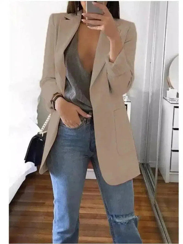 Blazer de corte à medida e combinação de calças de ganga casuais para mulher
