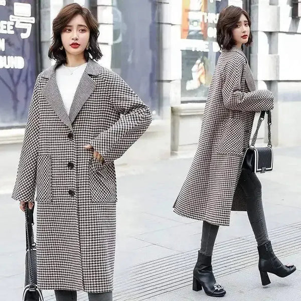 Casaco de inverno com bolsos, estilo houndstooth, para mulher