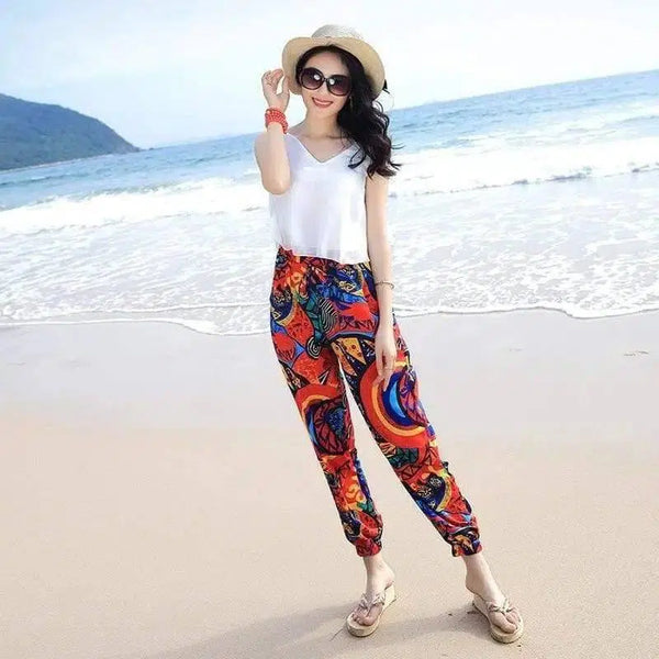 - Tipo de Peça: Roupa casual de verão com um top solto e calças com padrão vibrante