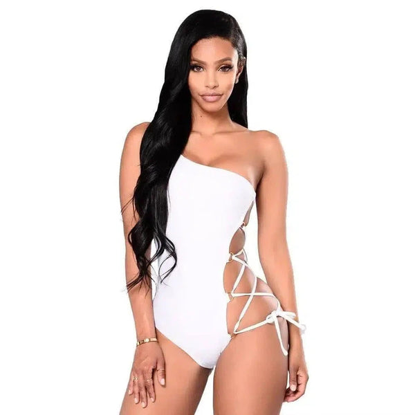Fato de banho de biquíni de um ombro só com alça cruzada em forma de argola