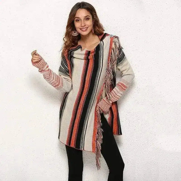 - Detalhes adicionais: Bainha assimétrica com detalhes de franjas; padrão listrado ousado em tons neutros e quentes