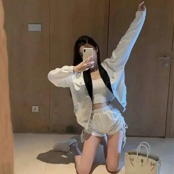 - Ajuste ou alongamento: Cintura ajustável com cordão nos calções; casaco solto
