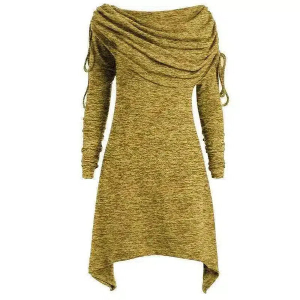Incorpore este elegante e único vestido assimétrico com decote drapeado no seu guarda-roupa para uma mistura de conforto