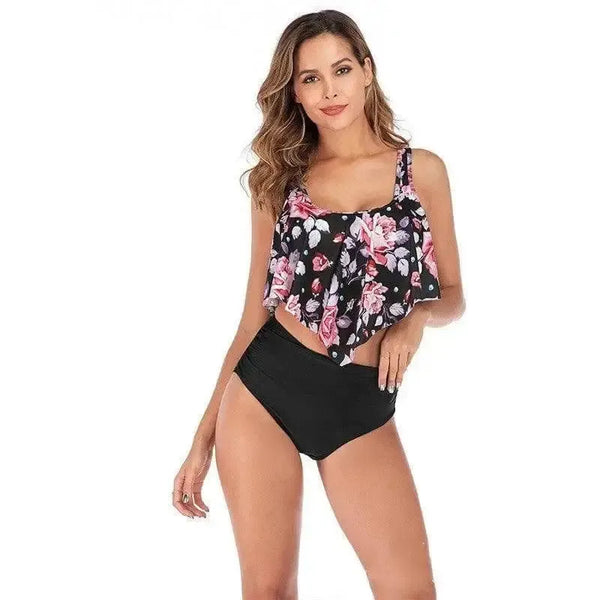 Descrição do Produto: Fato de Banho Dividido Mulheres Estampado Biquíni Cintura Alta Babados