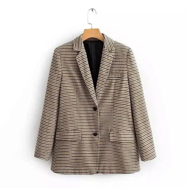 - Blazer clássico Houndstooth: Eleve o seu guarda-roupa com esta peça intemporal que apresenta um padrão tradicional houndstooth numa paleta de cores neutras.