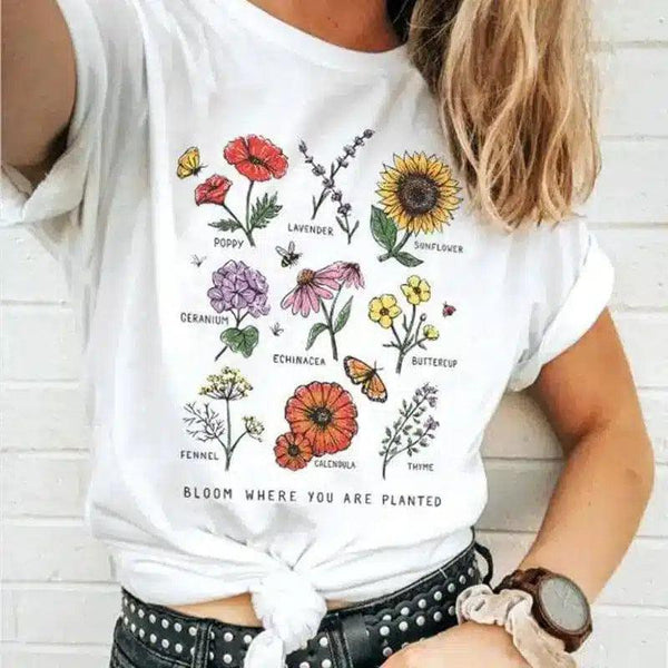 - Design: Estampado floral com a frase "BLOOM WHERE YOU ARE PLANTED"