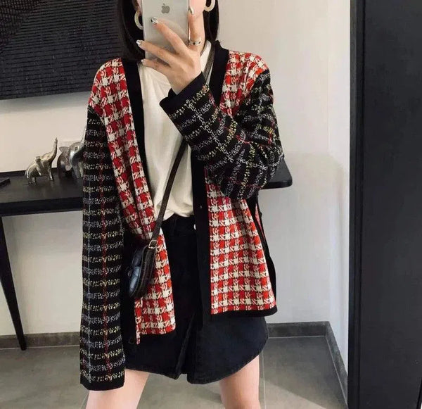 - Design de padrão intrincado: O blazer apresenta um padrão clássico de houndstooth em vermelho e preto, intercalado com fios metálicos sutis para uma pitada de brilho e glamour.