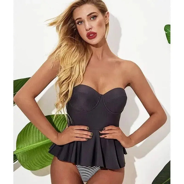 Descrição do Produto: Triangle Tube Top Pleated Skirt Split Swimsuit Women