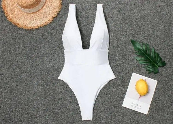 Peça única de senhora com decote em V, costas vazadas e cintura subida