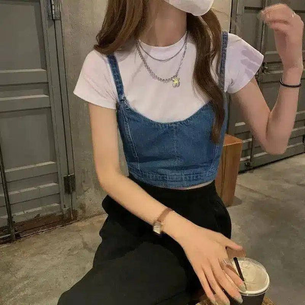- Tipo de peça: Conjunto em camadas com um top de ganga sobre uma t-shirt branca básica