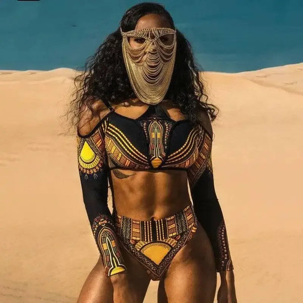 Biquíni de cintura subida estampado de manga comprida de duas peças para mulher