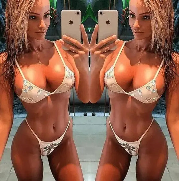 - Design: Conjunto de biquíni elegante e glamoroso adornado com detalhes luxuosos de diamantes e bling.