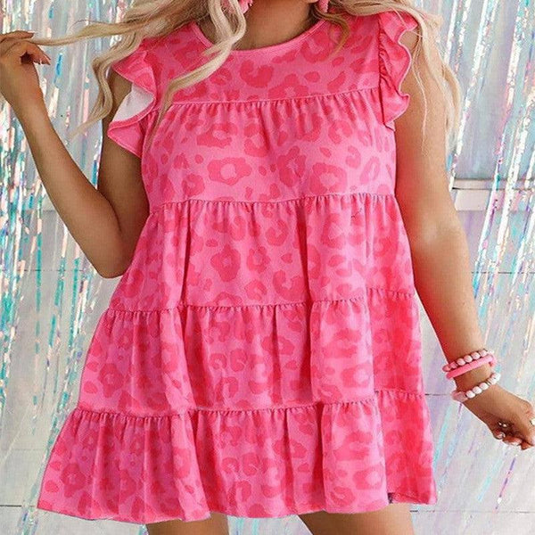 Minivestido de verão com estampado leopardo e decote redondo, com folhos e camadas