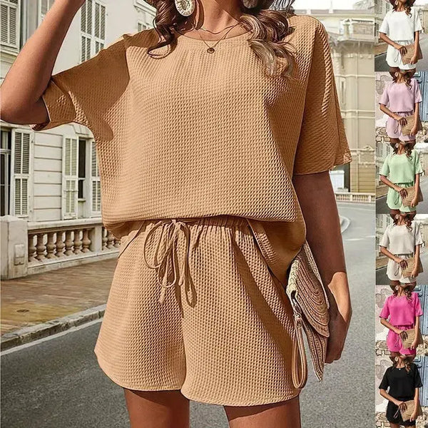 Novo Waffle Suit Feminino Manga Morcego Top de manga curta com gola redonda e calções com desenho de cordão Conjunto de duas peças de moda Roupa de verão