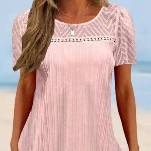 Pulôver em torno do pescoço renda patchwork camiseta de manga curta