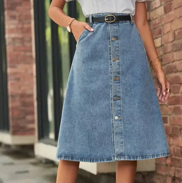 - Design: Saia de ganga lavada a condizer com um elegante detalhe de peito